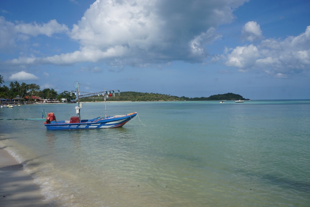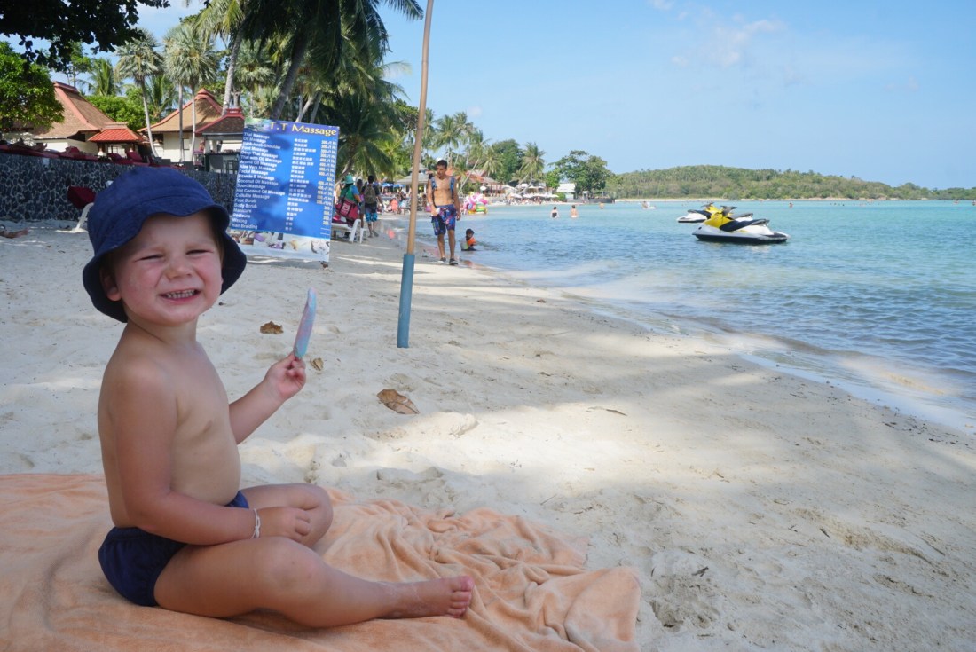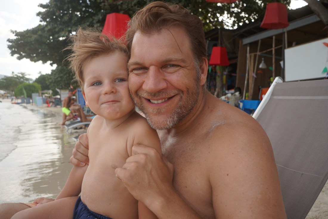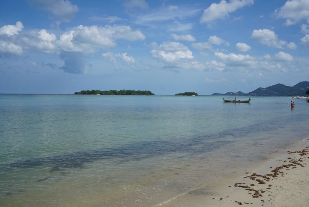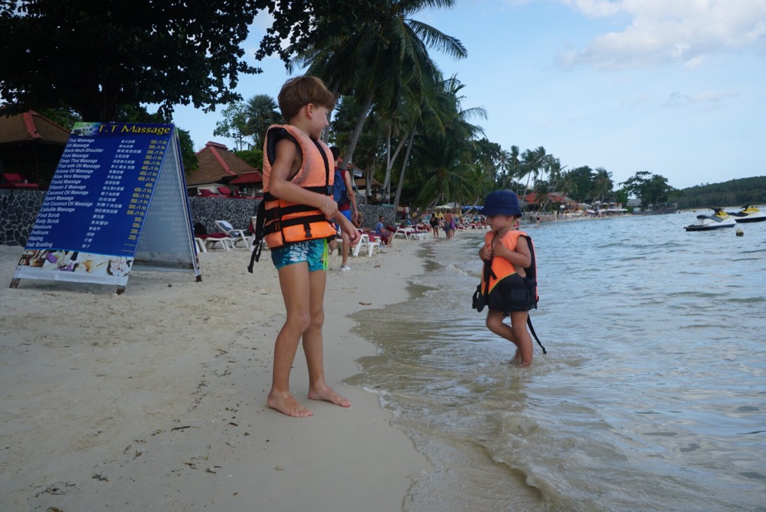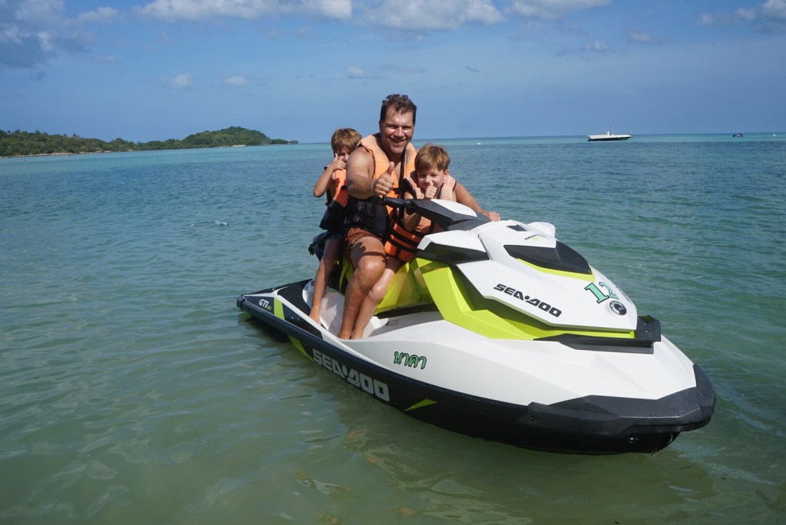 Zum ersten Mal seit unserer Abreise verweigert unser Tristan heute den Mittagsschlaf. Als ich gegen 14 Uhr vom Sport ins Zimmer komme, rüttelt er fröhlich am Gitterbett. Boris liegt, leicht genervt, im Bett und stellt sich stumm und regungslos. Er ist schon beim ‚Ich ignoriere den Irrsinn einfach!‘ angekommen. Auch die beiden Großen liegen mucksmäuschenstill in ihrer Schlafhöhle- ich kann Ihnen nicht verdenken, dass sie bei der Show, die der Knilch hier abzieht, nicht schlafen können. Von ‚Lalelu‘-singen über ‚Ich schimpf dich!!‘-meckern- heute hilft nix. Er schläft nicht. Um 14.30 Uhr ziehen wir den Stecker, pfeifen uns einen Müsliriegel rein und gehen Jet-Ski fahren. Und heute gehen wir einfach mal in die andere Richtung den Chaweng Beach entlang.
