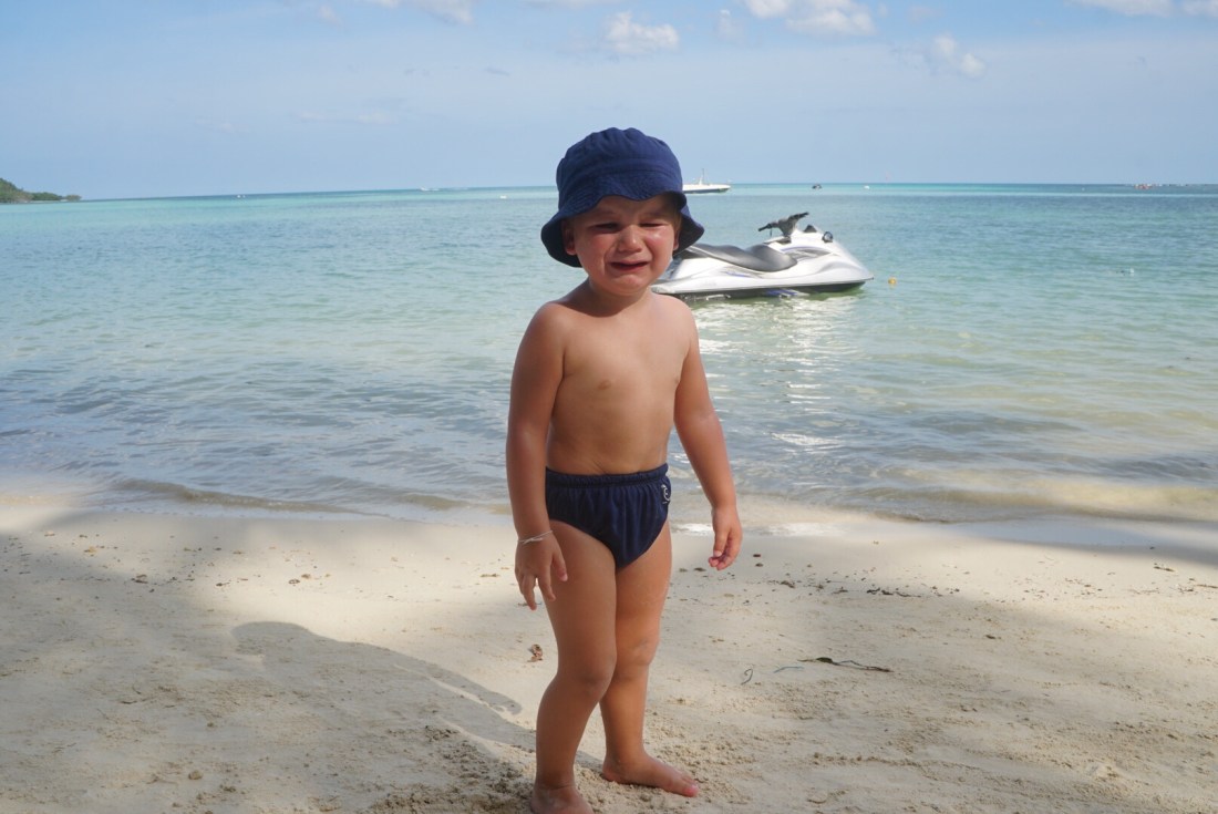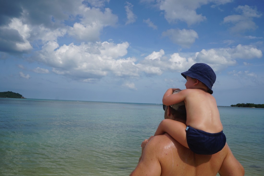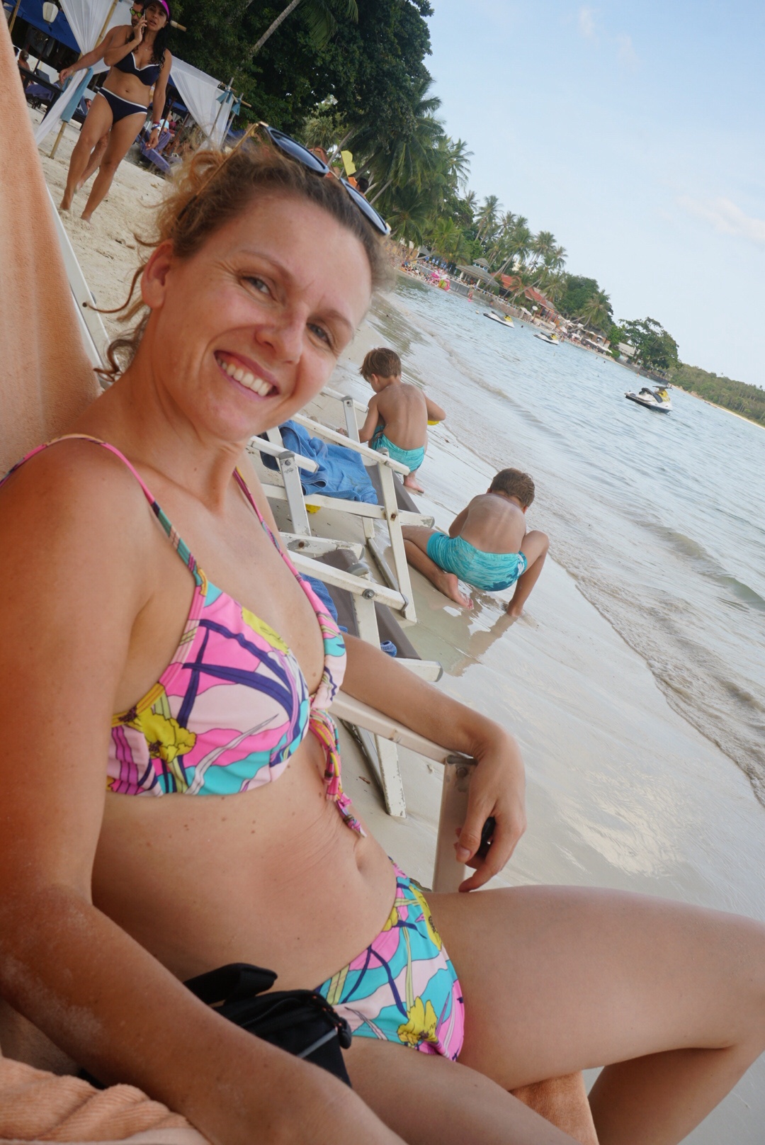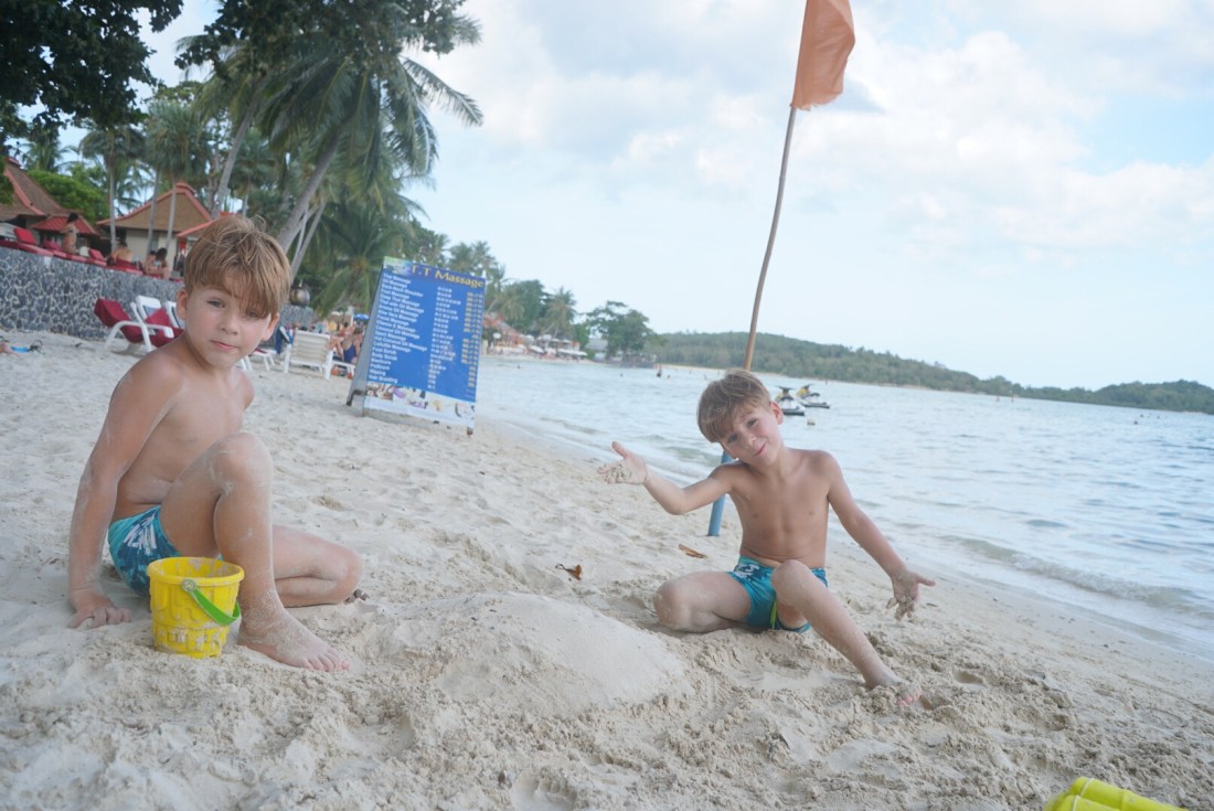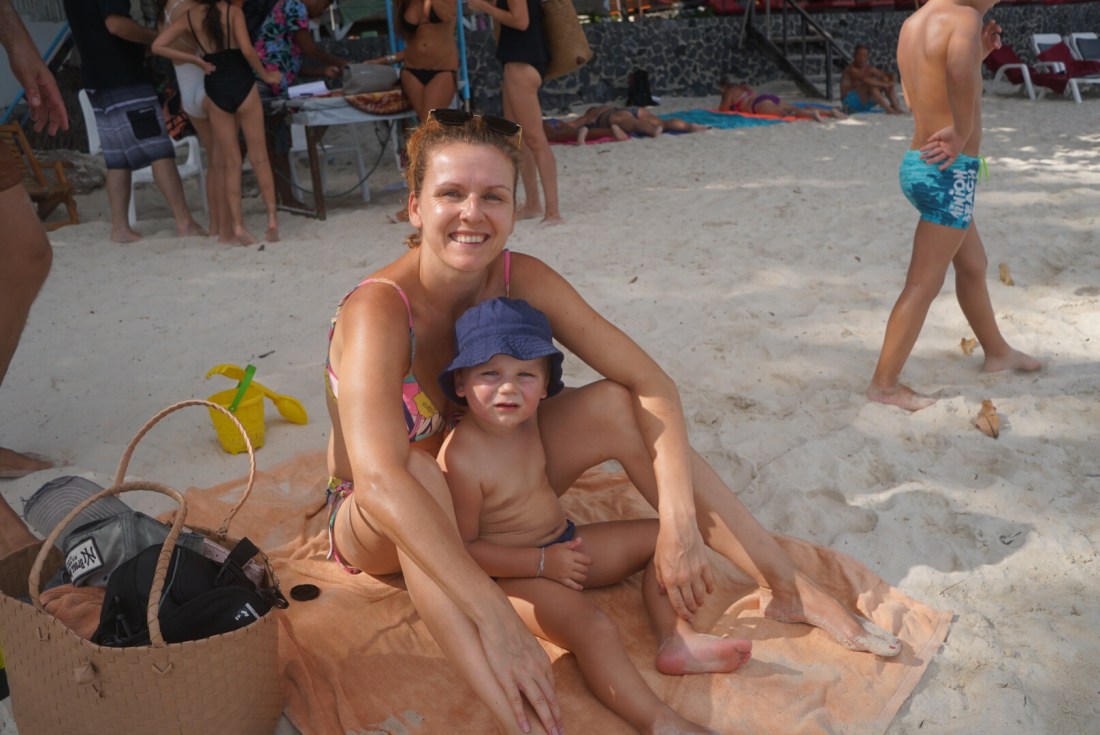 Zum ersten Mal seit unserer Abreise verweigert unser Tristan heute den Mittagsschlaf. Als ich gegen 14 Uhr vom Sport ins Zimmer komme, rüttelt er fröhlich am Gitterbett. Boris liegt, leicht genervt, im Bett und stellt sich stumm und regungslos. Er ist schon beim ‚Ich ignoriere den Irrsinn einfach!‘ angekommen. Auch die beiden Großen liegen mucksmäuschenstill in ihrer Schlafhöhle- ich kann Ihnen nicht verdenken, dass sie bei der Show, die der Knilch hier abzieht, nicht schlafen können. Von ‚Lalelu‘-singen über ‚Ich schimpf dich!!‘-meckern- heute hilft nix. Er schläft nicht. Um 14.30 Uhr ziehen wir den Stecker, pfeifen uns einen Müsliriegel rein und gehen Jet-Ski fahren. Und heute gehen wir einfach mal in die andere Richtung den Chaweng Beach entlang.