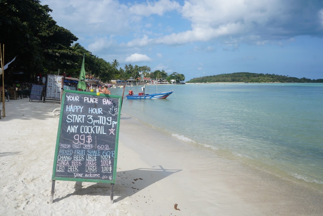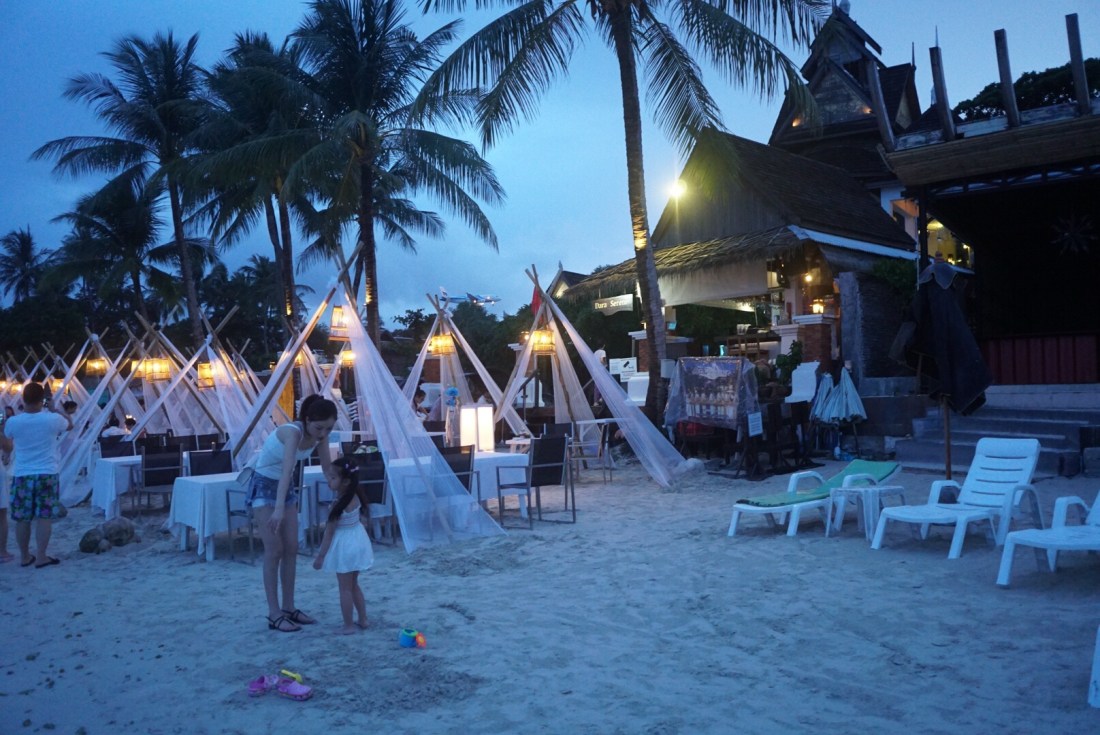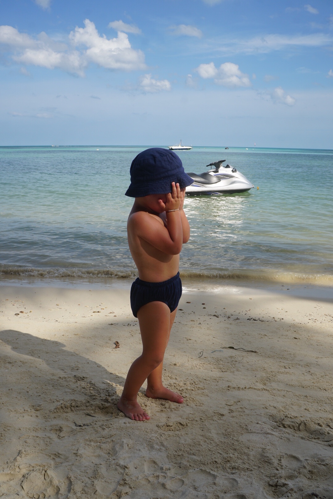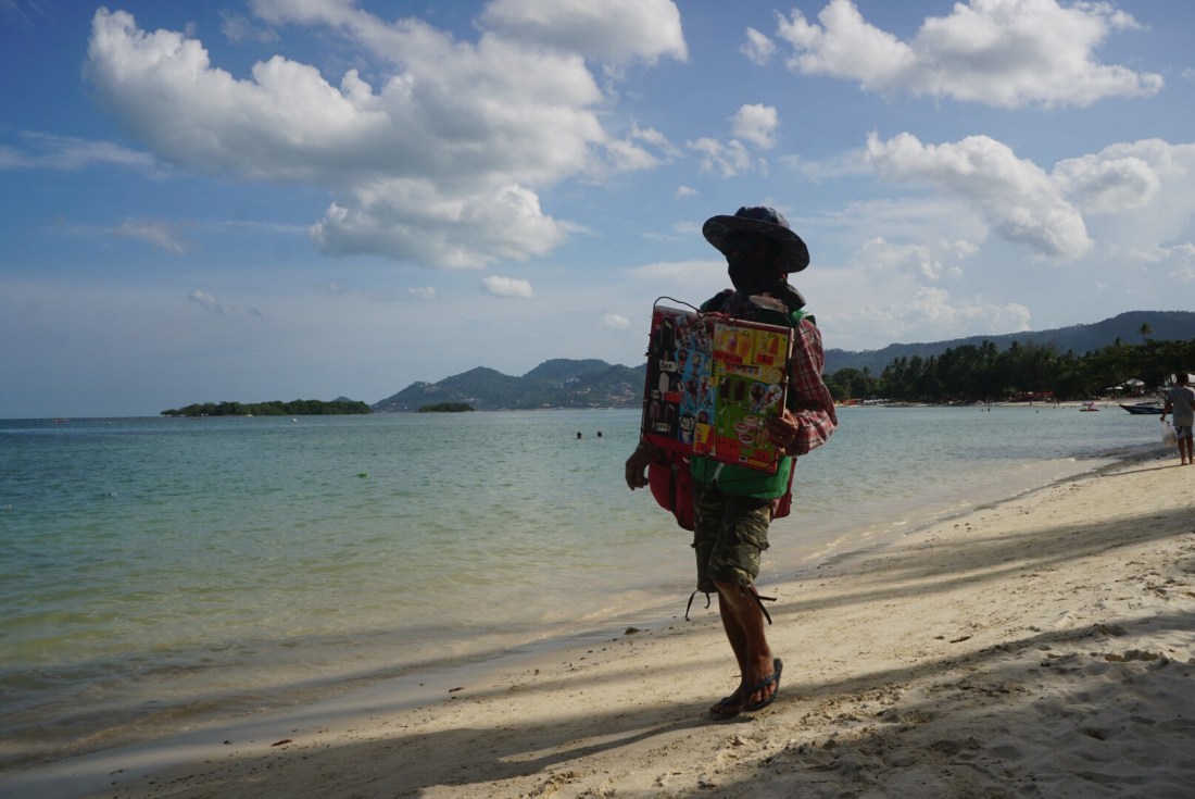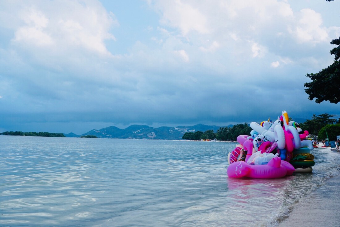 Zum ersten Mal seit unserer Abreise verweigert unser Tristan heute den Mittagsschlaf. Als ich gegen 14 Uhr vom Sport ins Zimmer komme, rüttelt er fröhlich am Gitterbett. Boris liegt, leicht genervt, im Bett und stellt sich stumm und regungslos. Er ist schon beim ‚Ich ignoriere den Irrsinn einfach!‘ angekommen. Auch die beiden Großen liegen mucksmäuschenstill in ihrer Schlafhöhle- ich kann Ihnen nicht verdenken, dass sie bei der Show, die der Knilch hier abzieht, nicht schlafen können. Von ‚Lalelu‘-singen über ‚Ich schimpf dich!!‘-meckern- heute hilft nix. Er schläft nicht. Um 14.30 Uhr ziehen wir den Stecker, pfeifen uns einen Müsliriegel rein und gehen Jet-Ski fahren. Und heute gehen wir einfach mal in die andere Richtung den Chaweng Beach entlang.