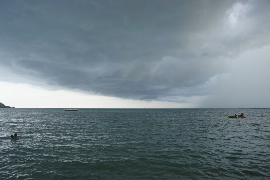 Die Wolkenwand, die sich hier entlang schiebt ist wirklich gewaltig. Wir müssen unsere Liegestühle räumen und ziehen ins Restaurant um, wo sich Ceddi und Deani einen Chicken- und einen Beefburger mit einer Riesenladung Reis reinhauen. Als es draußen mächtig zu prasseln beginnt, dürfen die beiden im Regen umher toben. Tristan ist aufgrund von Extremmüdigkeit nicht mehr in der Lage, auch noch dieses Highlight mit zu nehmen.